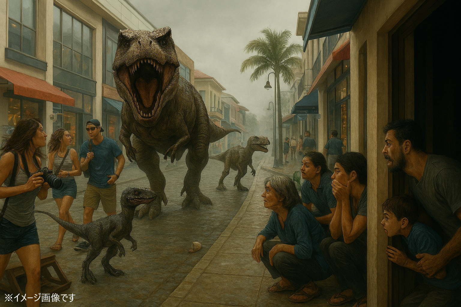 恐竜は檻の中で安全に管理され、 観光客はショーやアトラクションを楽しみ、 パークは世界的な成功を収めている。